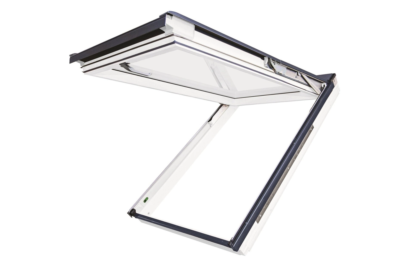 - Maksymalna wygoda użytkowania – otwieranie uchylno-obrotowe pozwala na łatwe wietrzenie i mycie szyb. Zawias umieszczony w połowie wysokości zapewnia stabilność i płynność ruchu, umożliwiając zatrzymanie skrzydła w pozycji między 0° a 45°, natomiast zawias umieszczony w górnej części skrzydła pozwala na pełne wykorzystanie przestrzeni na poddaszu i obrócenie skrzydła o 180°. Zmiana systemu otwierania skrzydła jest umożliwiona przez przełącznik preSelect. System naprowadzający skrzydło ułatwia precyzyjne zamykanie i zwiększa wygodę użytkowania. Jest to najchętniej wybierany system otwierania, zapewniający komfort i funkcjonalność.