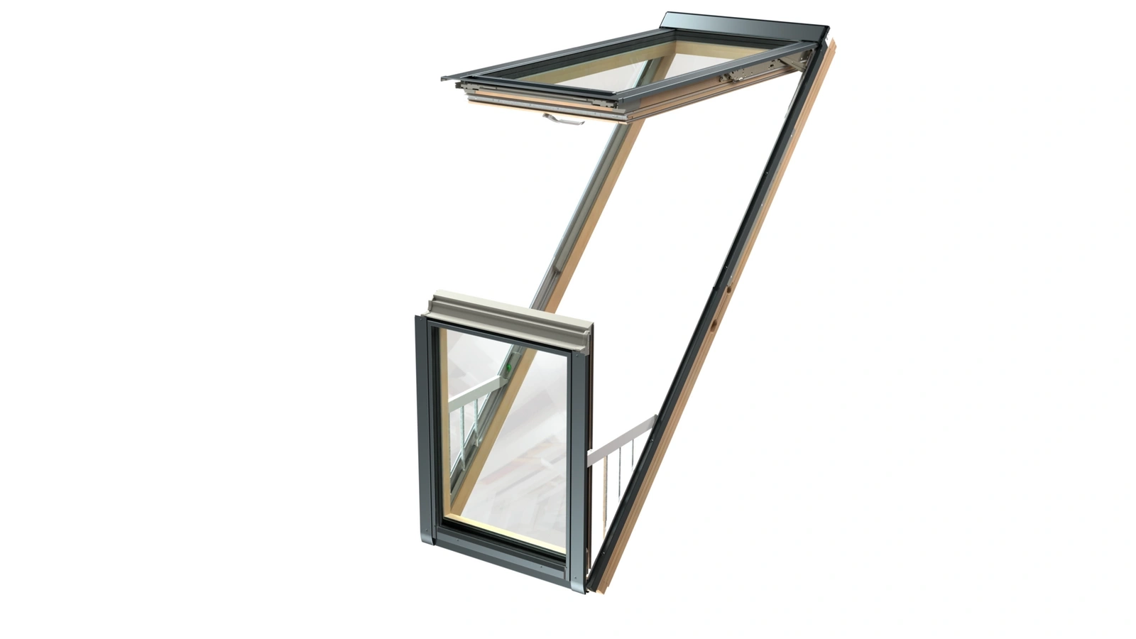 - Balkon w Twoim domu – innowacja i przestrzeń to nie jest zwykłe okno. Otwierając dwa skrzydła, tworzysz balkon wewnątrz dachu. Górne skrzydło unosi się uchylnie do góry, a dolne wysuwa do przodu, udostępniając wnękę z barierkami.