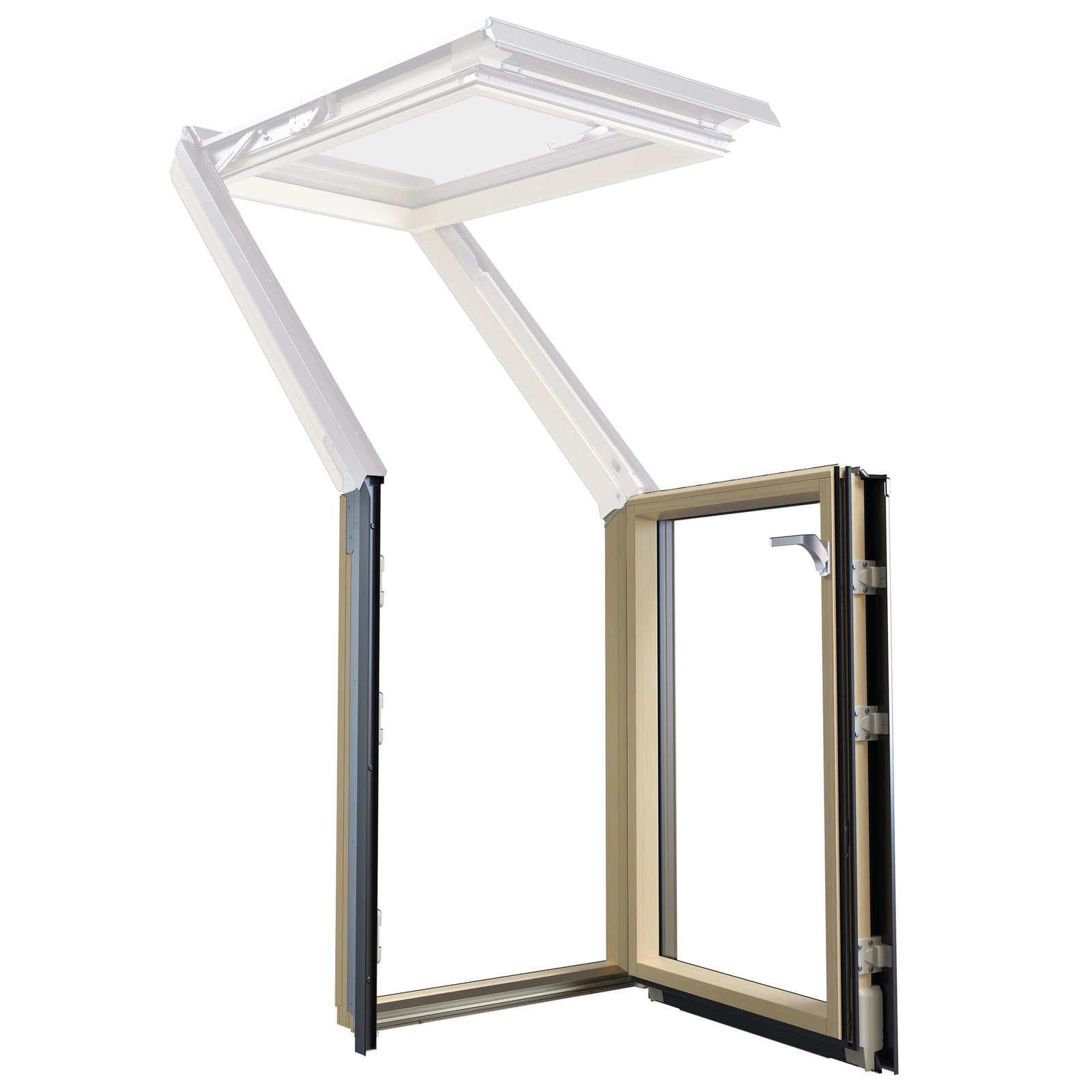 - Maksymalna wygoda użytkowania – otwieranie uchylno-obrotowe pozwala na łatwe wietrzenie i mycie szyb. Zawias umieszczony w połowie wysokości zapewnia stabilność i płynność ruchu, umożliwiając zatrzymanie skrzydła w pozycji między 0° a 45°, natomiast zawias umieszczony w górnej części skrzydła pozwala na pełne wykorzystanie przestrzeni na poddaszu i obrócenie skrzydła o 180°. Zmiana systemu otwierania skrzydła jest umożliwiona przez przełącznik preSelect. System naprowadzający skrzydło ułatwia precyzyjne zamykanie i zwiększa wygodę użytkowania. Jest to najchętniej wybierany system otwierania, zapewniający komfort i funkcjonalność. Okno dolne zwiększa ilość wpadającego światła do pomieszczenia, zastępując konieczność zespalania dwóch okien i umożliwiając wyjście na taras.