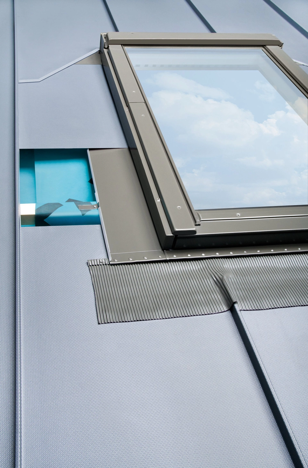 • Kołnierz uszczelniający EBV-P zapewnia szczelne połączenie okna połaciowego z pokryciem dachowym typu blacha panelowa – blacha z prefabrykowanym (systemowym) rąbkiem.