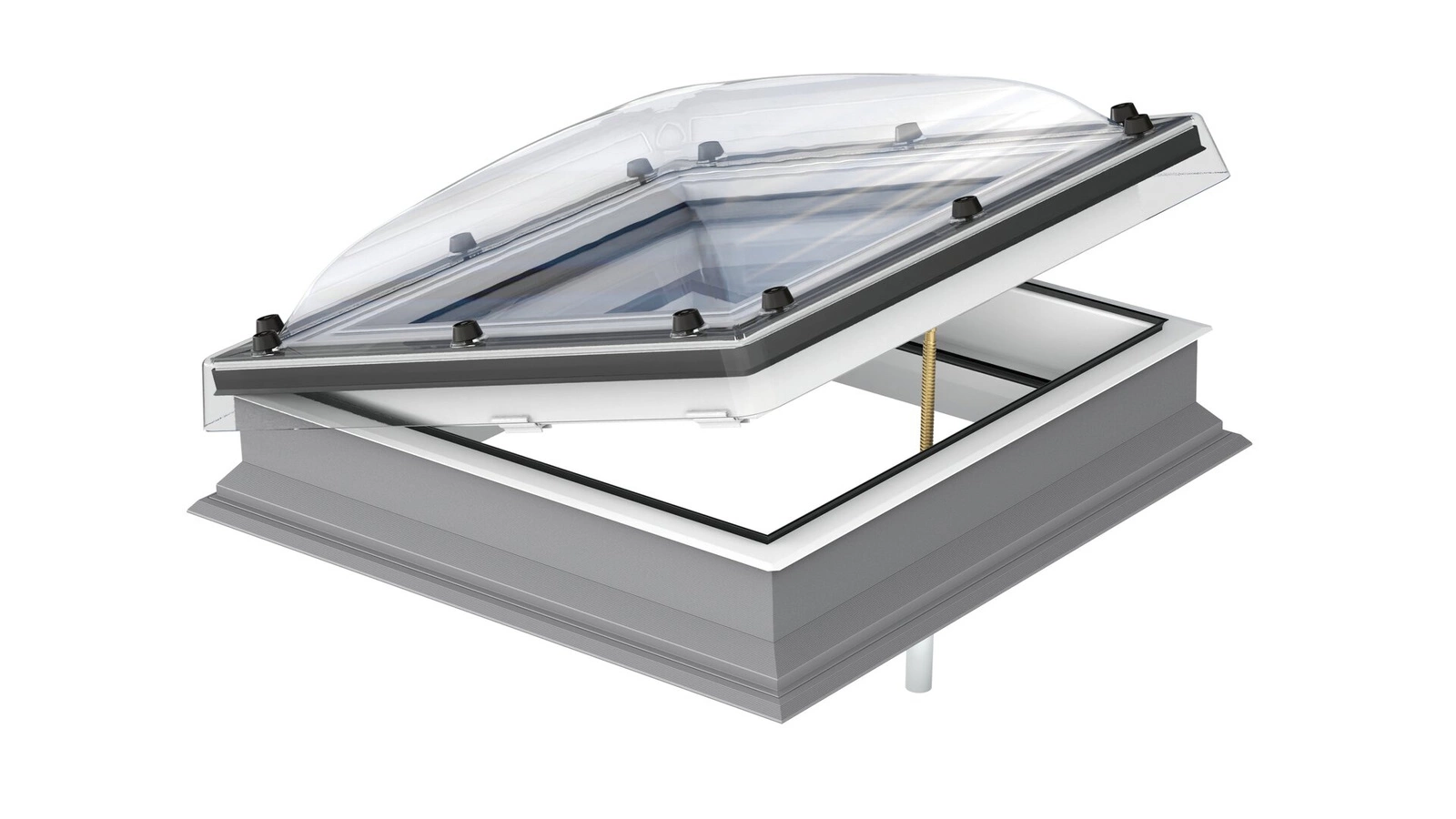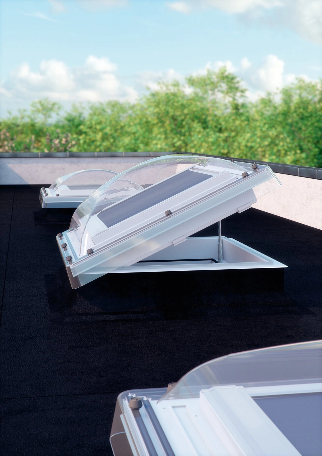 - transparentna kopuła okna zbudowana jest z wytrzymałego poliwęglanu - duża odporność na uderzenia oraz czynniki atmosferyczne. Specjalne powłoki na czaszy zabezpieczają przed promieniowaniem UV.