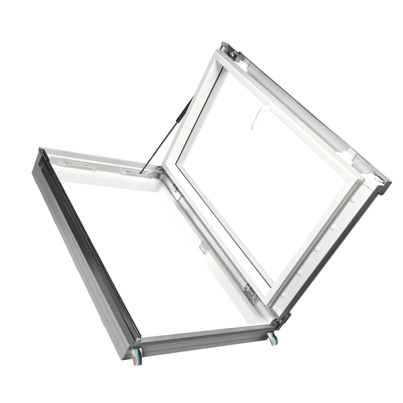 - Siłownik gazowy umieszczony w górnej części wyłazu, ułatwiający otwieranie i zamykanie skrzydła ograniczając ryzyko zatrzaśnięcia np. pod naporem wiatru.