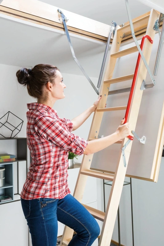 - Stopnie antypoślizgowe oraz znaczne odsunięcie drabinki od klapy schodów dodatkowo ułatwiają poruszanie się po nich.