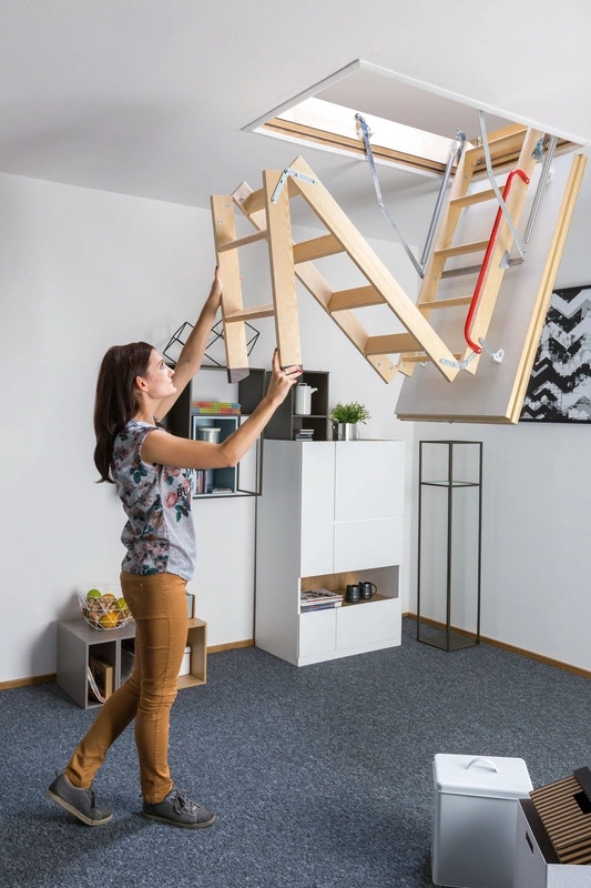- Schody strychowe Fakro podczas składania i rozkładania drabinki nie wymagają dużej przestrzeni, a po złożeniu "chowają się" w stropie.
