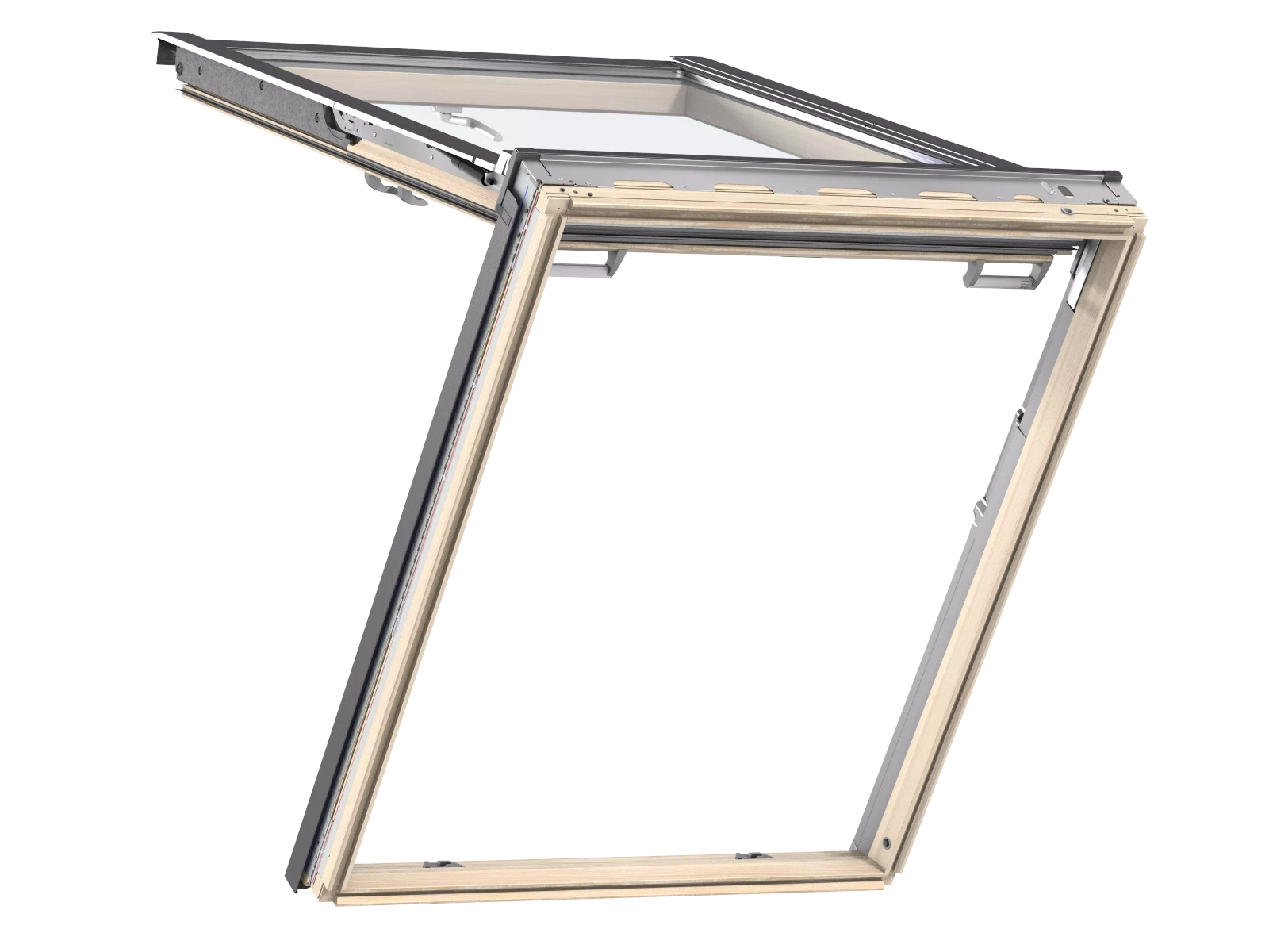 Ewakuacyjne okno klapowo-obrotowe VELUX otwiera się na zewnątrz pod kątem do 45⁰. W sytuacji awaryjnej skrzydło okienne można otworzyć pod kątem 67⁰, popychając je ku górze. Cały otwór okienny zapewnia teraz możliwość szybkiego i łatwego wyjścia oraz wejścia. Okno dachowe jest obsługiwane od dołu za pomocą uchwytu na dolnym skrzydle. Aby w pełni korzystać z funkcji otwierania w trybie klapowym, zalecamy wysokość montażu, która pozwala uzyskać wyraźny widok na zewnątrz zarówno z pozycji stojącej, jak i siedzącej.