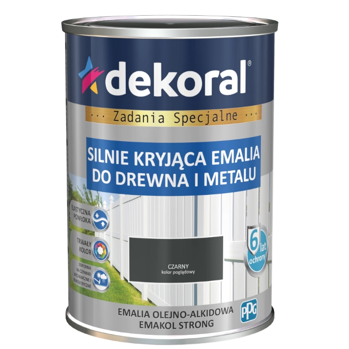 Farba ogólnego stosowania olejno-alkidowa DEKORAL SILNIE KRYJĄCA EMALIA DO DREWNA I METALU czarny RAL 9005 0,9l