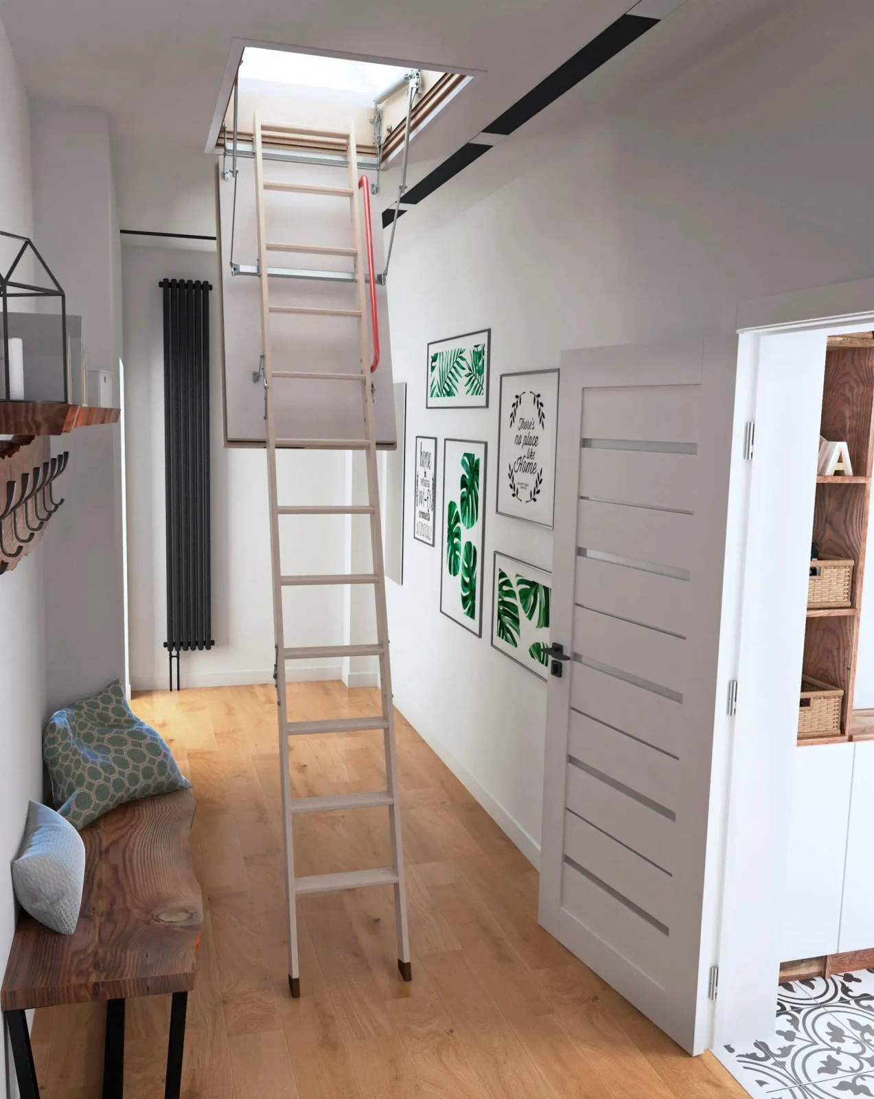 - Stopnie antypoślizgowe oraz znaczne odsunięcie drabinki od klapy schodów dodatkowo ułatwiają poruszanie się po nich.