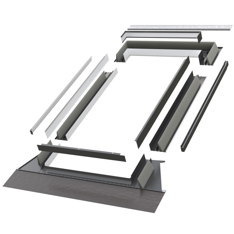 Kołnierz uszczelniający, który pozwala na szczelne połączenie okna z profilowanymi pokryciami dachowymi takimi jak: dachówka, blacha wysokoprofilowana. Może być stosowany do pokryć dachowych o wysokości profilu do 90 mm. Stosowany przy wymianie okien konkurencji na okna FAKRO bez naruszenia istniejących szpalet. Kołnierz umożliwia dopasowanie go do głębokości montażu okna wynikającej z osadzenia nowego okna na szpaletach pozostałych po wymienianym oknie.